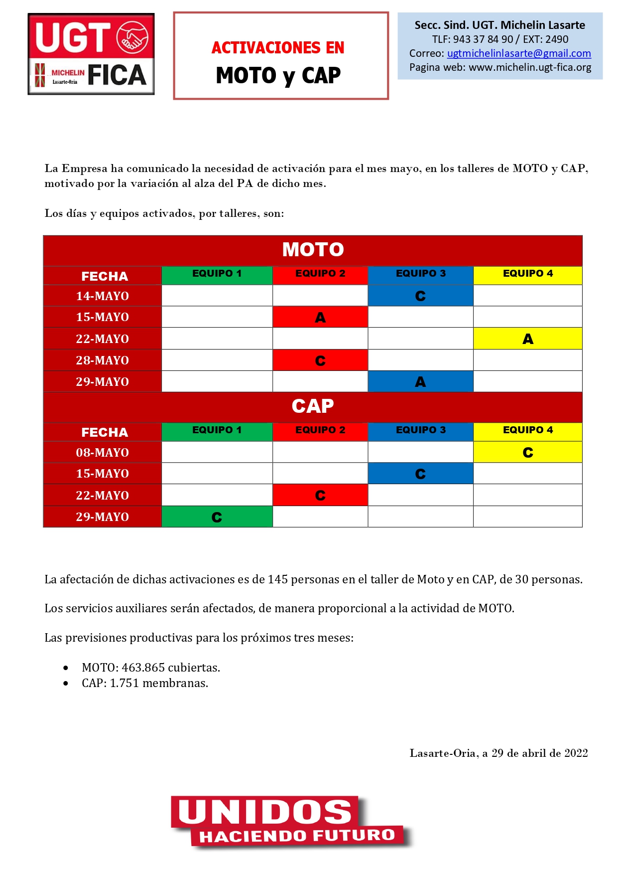 02 Mayo 2022 LASARTE ORIA: Activaciones CAP y Moto La empresa a comunicado activaciones para el mes de mayo en los talleres de CAP y Moto. Mas información...